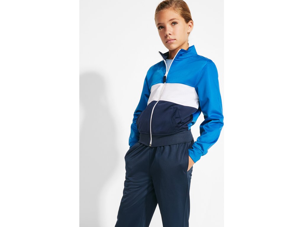 Sportovní souprava, která obsahuje bundu a kalhoty. Vysoký límec. Přední kapsy s lemem. Manžety a pás v žebrovaném lemu 1x1. Celopropínací zip. Kalhoty s pružným pasem se dvěma bočními kapsami s kontrastním lemem. Velmi příjemná vnitřní strana.